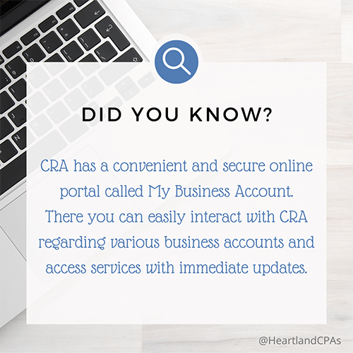 The CRA My Business Account is a secure online portal where you can keep track of business accounts and communicate online with CRA in a fast, safe, and easy-to-use format.